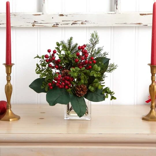 with a bundle of lush vibrant red berries and a various mix of green leaves, this artificial berry pine arrangement will bring a festive holiday look to your décor. It comes in a beautiful glass vase. While it’ll make a great centerpiece on a end table, you can also use it in your office by placing it on your work desk near your nameplate and business card holder for an attractive executive arrangement. Â