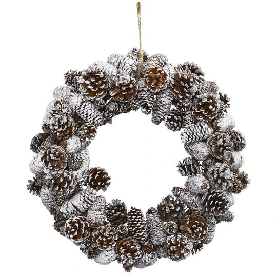 Create the perfect farmhouse holiday display with this snowy pinecone wreath. Dusted in white decorative detail, each pinecone is intricately placed to create a long-lasting, timeless holiday piece. Pair it with burlap accents and metallic details to create a cozy, country look.