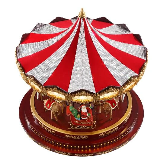 The Swarovski Grand Carousel from Mr. Christmas shimmers and shines, creating an eye-catching magical display. A smiling Santa in his sleigh waves while his adorable reindeer rise and fall as the carousel turns. 136 LED lights illuminate the carousel’s marquee, base, and center panels and almost 4,000 Swarovski crystals decorate the roof and animals creating a dazzling display as the carousel rotates. This adaptor-operated carousel plays 20 of your favorite Christmas carols, and a built-in volume control allows you to enjoy with or without music.