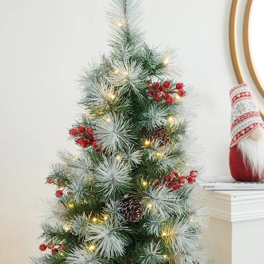 This 5 ft. mixed tips pine entrance potted tree with decorative urn base is a welcoming addition to doorway, deck, porch or patio. It features snow sprinkled branches and is trimmed with red berries, and big pinecones. This tree is pre-lit with 150 warm white lights that remain lit even if a bulb burns out. Display this attractive greenery in any indoor or covered outdoor location.