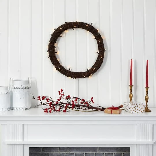 Add a little decorative accenting to an empty wall or doorway with the help of this artificial vine wreath. Intricately designed with a twig-like base, this decorative wreath comes already pre-strung with warm white LED lights to give a soft, illuminating glow to an otherwise bare space.