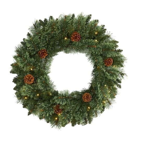 Light up your seasonal accents with this artificial wreath designed from realistic looking mountain pine foliage in seasonal evergreens, accented with faux pinecones that look incredibly lifelike. Pre-strung with clear LED lights, this decorative wreath makes for an inviting accent all throughout the holiday season.