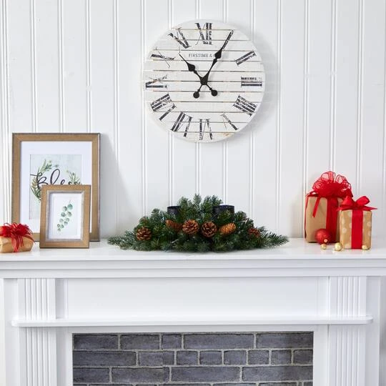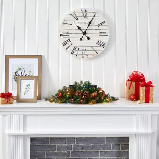 Set your home aglow this holiday season with the help of this candelabrum. Specifically designed as an elaborate candle holder, it is intricately designed from a rich overgrowth of realistic looking flocked pine greenery, handsomely accented with miniature faux pinecones and glitter, all carefully surrounding 2 simple candle holders. Better yet, this seasonal centerpiece comes already pre-strung with multicolored lights, eliminating pre-tangled messes and holiday stress. Reaching 24 inches long, this winter-ready decorative accent will make an enchanting addition to a mantle or a holiday-inspired tablescape.