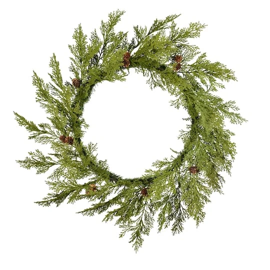 Add some holiday spirit to your front door or mantle with this beautiful green wreath. This wreath comes unlit and features cedar foliage with natural looking pinecones. It can be used just as it is or customized with your favorite lights, ornaments, ribbons or holiday picks.