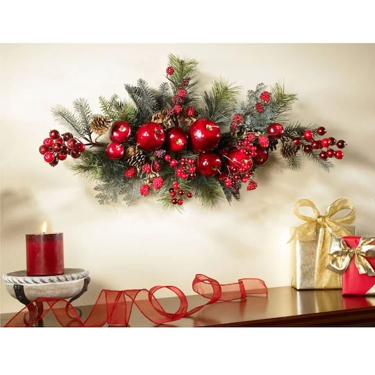 Create a vibrant splash in your home or office décor with this stunning apple, pine, and berry swag. Perfect for the holiday season, this colorful work of art contains a mix of juicy red apples and plump ripe berries surrounded by lush pine foliage. This finely crafted design adds a touch of authentic beauty to any room it graces. A full 30 inches in length, it’s the perfect size to drape across a fireplace mantle or dining room table.