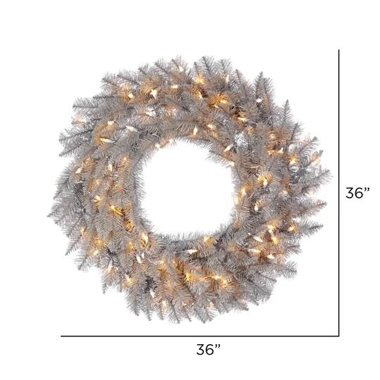A wonderful alternative to traditional green wreaths, this amazing wreath is made of brilliant platinum-colored PVC tips and comes pre-lit with warm white Dura-Lit LED mini lights. It makes the perfect holiday accent for your front door or mantel.