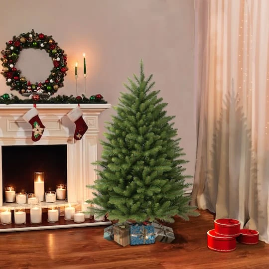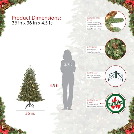 Bring the holiday spirit into your home with this 4.5′ Fraser Fir Artificial Christmas Tree. With life-like pine needles on its hinged green branches, this artificial tree is sure to add warmth to any room or space for years to come. The unlit tree’s included sturdy metal base will safely and steadily support your tree and decorations. Constructed from flame-retardant and non-allergenic materials, this tree provides a safer alternative to real trees.