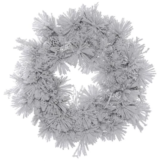 Add some wintry holiday cheer to your front door or mantle with this beautifully flocked Alberta Spruce Christmas wreath. This frosty wreath comes unlit and features heavily flocked PVC tips with realistic pine cone accents. It measures 48″ across the diameter from the end of one tip to another.