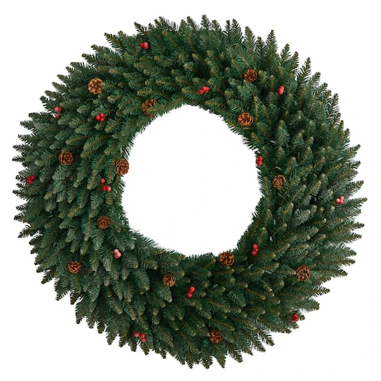 Add the WOW factor to your holiday décor with this flocked artificial Christmas wreath intricately designed from realistic looking pine foliage in a palette of seasonal evergreens flocked in a coat of faux-snow, carefully accented throughout with faux pinecones and berries that look incredibly realistic. Arriving pre-strung with 150 clear LED lights to effortlessly illuminate either a large wall or door, this 4 ft. (in diameter) decorative wreath makes for an inviting accent and will undoubtedly transform any entrance all throughout the holiday season. Perfect for a large space in need of some holiday cheer. Artificial wreaths are manufactured using synthetic materials, such as polyester material or plastic, and are well designed and constructed to be life-like in appearance. This item will need to be re-shaped when removed from the secure box to allow it to reach its fullest size. Your wreath will look beautiful for years to come; simply wipe clean with a soft dry cloth when needed.