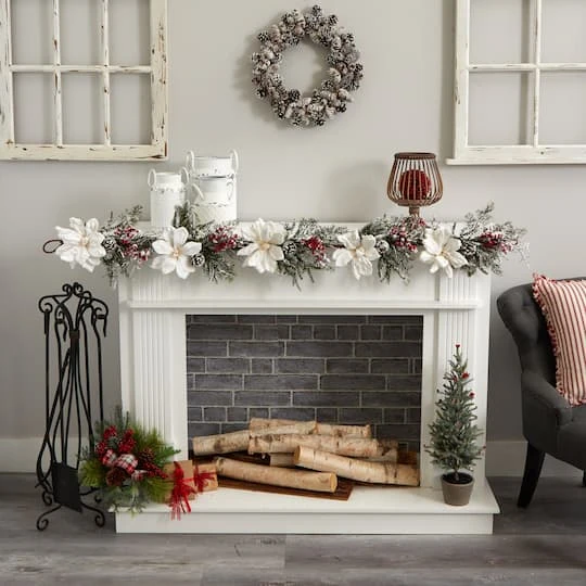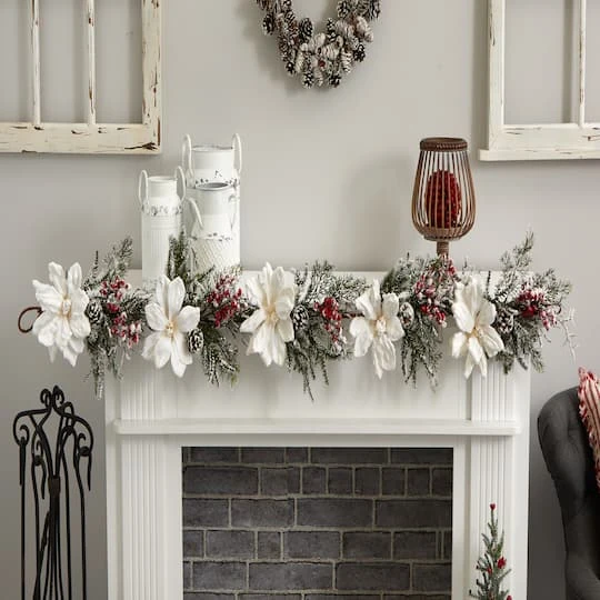 Bring all your other decorations together with this 5ft faux magnolia garland. Create your holiday layout on a mantle or sofa table by draping this around your other objects, and enjoy the high summer blooms in the dead of winter. Frosted pine and red berries complement the white of the blooms.