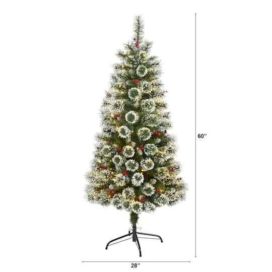 Evoke hints of a winter wonderland with this frosted artificial Christmas tree! Boasting tiers of soft looking pine foliage made up of 339 bendable branches for holiday ornaments, accented throughout with realistic looking faux holly berries, and lightly frosted with faux snow to evoke a winter setting. Pre-strung with 200 clear LED lights and stabilized on a metal stand, this 5’ tall frosted artificial Christmas tree will ensure your home is holiday-dressed for years to come.