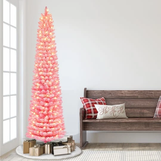 Give your décor a never-before appeal with this Pre-lit Snow Flocked Pink Pencil Christmas Tree. Guaranteed to be an immediate eye-catcher, this artificial Christmas tree is made with a distinctly colorful design that breaks free from the traditional styles. It’s flocked with a sprinkling of faux snow for a beautiful wintry vibe and includes 300 UL clear incandescent lights. The pre-strung bulbs provide a festive glow to your space while also saving you the time and trouble of stringing bulbs onto the tree. Assembly is easy. Just connect the tree’s components, adjust the branches, and plug in the lights for a show-stopping holiday centerpiece. This Christmas tree’s slender pencil shape fits into tighter spaces, providing additional convenience and versatility. Made with strong and durable steel components and 708 branch tips, this item is built to last. Flame retardant and hypoallergenic materials make it a safer choice when compared to real trees. This product is backed by a 5-year warranty on the tree and a 2-year warranty on lights for years of quality use.