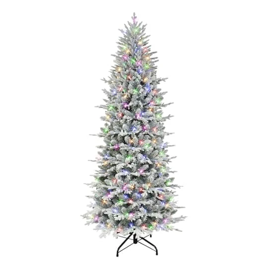 Embrace the joy of the holiday season into your home with the Puleo International Pre-Lit Flocked Slim Northern Fir Christmas Tree. This 7.5-foot tall artificial holiday tree with elegant snow-dusted pine needles stimulates a realistic feel to deliver a perfect touch of snowy ambiance even if a white Christmas is not on the forecast. Decorated with 400 pre-attached Color-Select LED lights, this pre-lit tree illuminates your home with a colorful festive glow through foot pedal activation and a UL listed adaptor while eliminating the time-consuming hassle of hanging lights around your tree. The snow flocked northern fir tree has a full and natural appearance with a total of 2,365 branch tips, gorgeous life-like branches, and a classic conical shape for an authentic wintry forest impression. Assembly is simple and quick with easy to hinge branches, and a metal stand is included for convenient placement anywhere in your home.