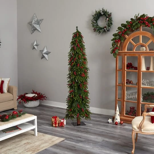 Get your home into the Christmas spirit this season with the help of this artificial Christmas tree. Easy to set-up and entirely maintenance-free, this realistic looking artificial Christmas tree boasts a traditional silhouette of seasonal foliage, made up of 565 bendable branch tips, handsomely accented throughout with faux holly berries that look incredibly lifelike. Arriving pre-strung with 300 color changing LED lights, it also features 8 different light options (including Twinkle, Bursts, and Fade) to create a true holiday glow wherever displayed. Carefully stabilized on a metal stand, this evergreen 7 ft. tall artificial Christmas tree will create a picture-perfect holiday setting, year after year. Faux Christmas Trees are manufactured using synthetic materials, such as polyester material or plastic, and are well designed and constructed to be life-like in appearance. This item will need to be re-shaped when removed from the secure box to allow it to reach its fullest size. Your artificial Christmas Tree will look beautiful for years to come; simply wipe clean with a soft dry cloth when needed.