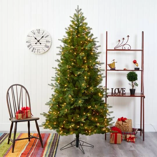 Create a traditional Christmas scene without the need for upkeep with the help of this easy and effortless artificial Christmas tree! Completely maintenance-free, this realistic looking fake Christmas tree boasts tiers of evergreen foliage made up of 843 easy-to-bend branch tips for showcasing your favorite holiday ornaments. Arriving pre-strung with 450 warm white lights to eliminate tangles and carefully stabilized on a metal stand, this handsome 7’ tall artificial Christmas tree will not only make decorating a breeze but ensure your home is always holiday-dressed for years to come.