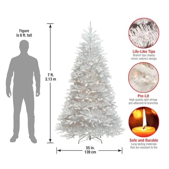 The Dunhill white fir is an attractive alternative to the traditional green holiday centerpiece. Your colorful holiday trimmings will really stand out on this bright white background. The Dunhill white is pre-strung with clear lights that remain lit even if a bulb burns out. This three section tree features hinged branches for ease of assembly and comes with a sturdy folding metal tree stand.