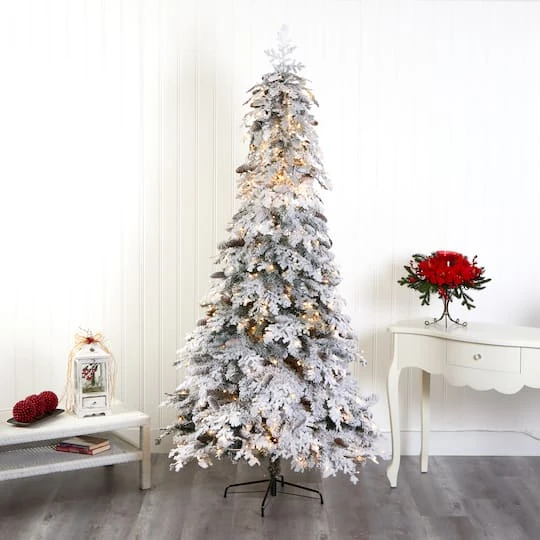 Create the ultimate winter wonderland scene in your home or office with the help of this flocked artificial Christmas tree! Completely maintenance-free, this winter-inspired fake Christmas tree boasts an array of soft looking foliage, all beautifully flocked in a snow-like effect throughout its bendable branches, perfect for accenting with holiday accents and accented with faux pinecones that look incredibly lifelike. Arriving pre-strung with LED lights to eliminate tangles and stabilized on a metal stand, this majestic 8 foot tall artificial Christmas tree will not only make holiday decorating a breeze but ensure your home is always looking picture-perfect throughout the holiday season. Â