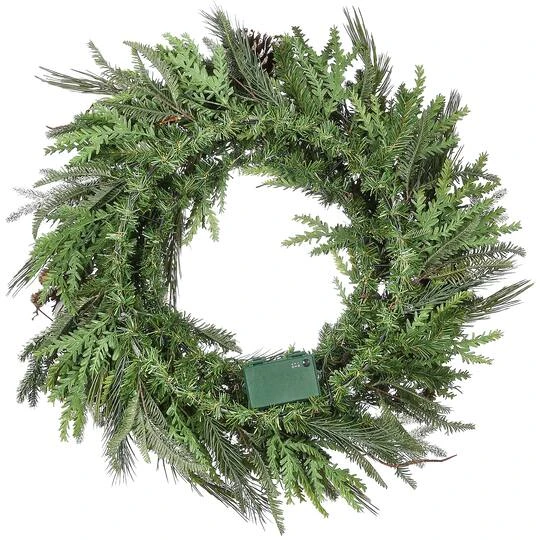 This evergreen wreath features Feel Real® branch tip technology, creating a decoration with remarkable realism. These crush-resistant branch tips are molded from real tree branches for an authentic appearance. It is decorated with pinecones, snowflakes, and white ball ornaments and pre-strung with 50 battery-operated warm white LED lights. 6 hours ON/18 hours OFF timed operation. This attractive holiday wreath can be displayed on doors, walls, and windows in indoor or covered outdoor locations.