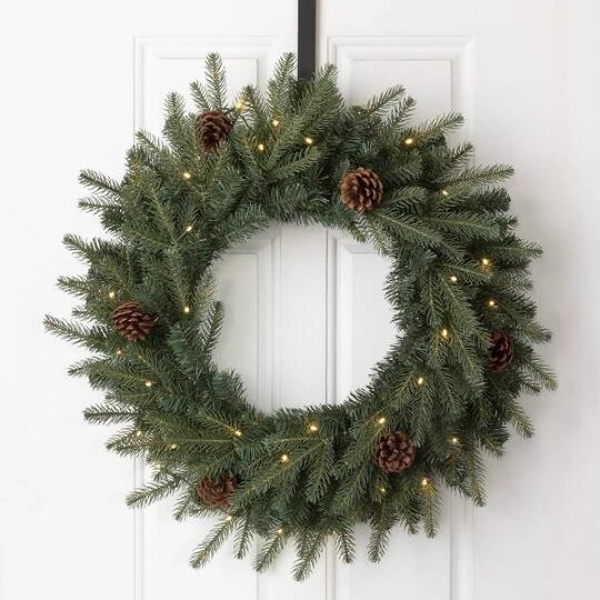This 24″ greenery Christmas wreath crafted with pine needle tips and pinecones will add a touch of charming light and cheer to your front door or window during the holiday season.