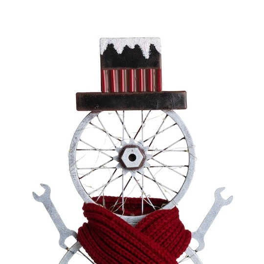 Decorate and celebrate this holiday with this metal bicycle wheel snowman porch sign. It features a snowman consisted of three whitewashed bicycle wheels, a black metal hat covered with snow, and a red knitted scarf. With a flat metal base, the sign could stand stable on the floor and is ideal for your porch and home.