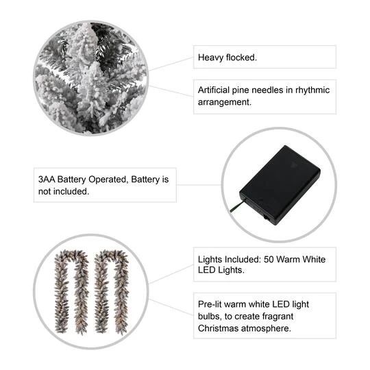 These 9 ft. snow flocked garlands provide ample length to easily adorn doors, mantles or banisters, making these versatile decorations ideal for any situation. Each of the 220 tips is modeled to a pine tree, while the snow flocked design creates a winter wonderland around your home. Several large pinecones decorations among the needles add an extra holiday touch to this garland.