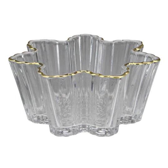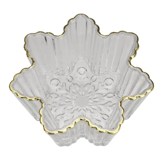 Your guests will feel like royalty as they reach for your festive treats in this elegant snowflake shaped glass candy dish with beautiful gold accents! The exterior has a ribbed design for added dimension. The bottom of the bowl has raised beveled detail in the shape of a snowflake.